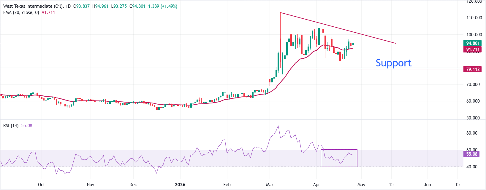 纽约商品交易所(NYMEX)西得克萨斯中质原油(WTI)期货在周一欧洲交易时段上涨1.5%,至接近95.00美元。由于美伊和平谈判陷入僵局,霍尔木兹海峡这一全球近20%石油供应的重要通道仍然关闭,推动油价上涨。