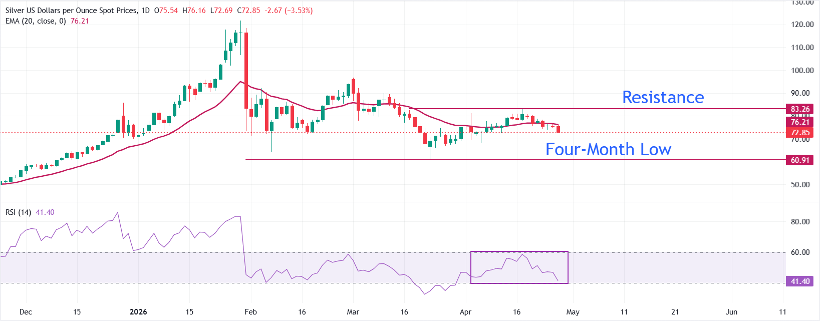 银价(白银/美元)在周二欧洲交易时段下跌近3%,跌破73.00美元。随着投资者在美联储(Fed)周三货币政策公告前转为谨慎,该白色金属面临强烈抛售压力