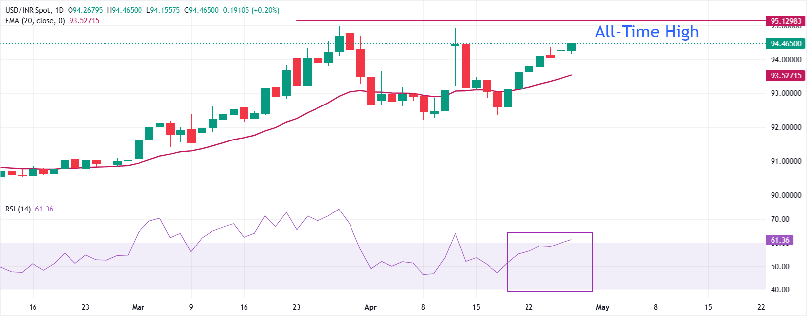 印度卢比(INR)在经历了过去两个交易日的短暂暂停后,周二兑美元(USD)进一步走弱。由于油价持续高企,美元/印度卢比(USD/INR)汇率跳升至接近94.50。