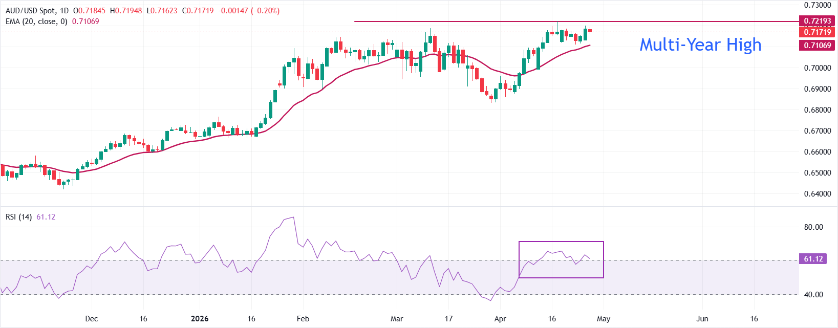 周二欧洲交易时段,澳元/美元下跌0.16%,报约0.7175。由于美元(USD)在为期两天的美联储(Fed)货币政策会议开始前表现强劲,澳元对主要货币对手面临轻微抛售压力。