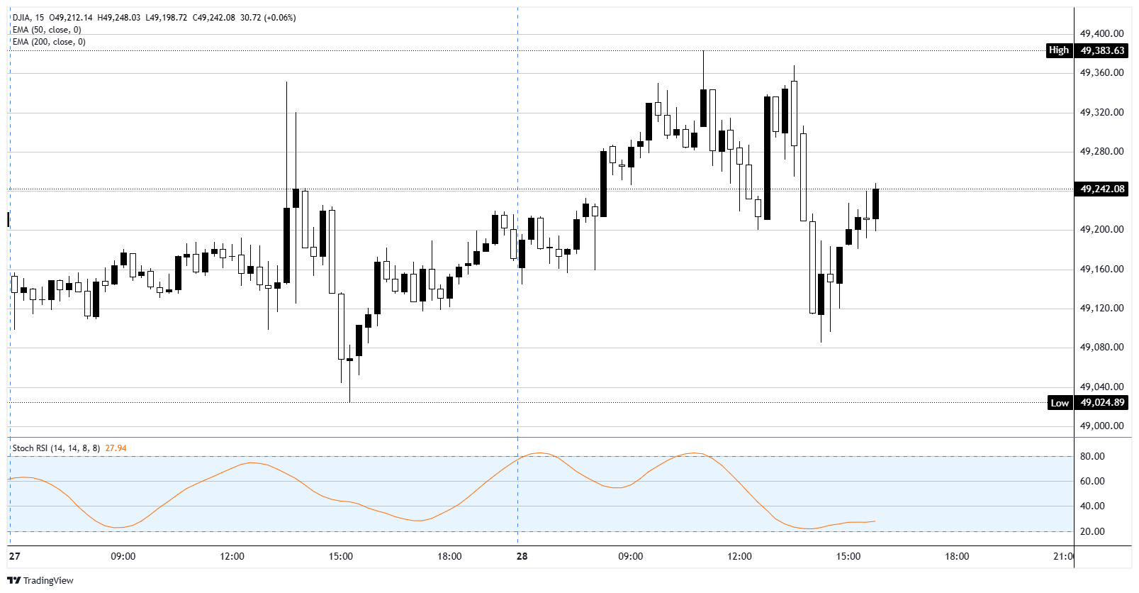 道琼斯工业平均指数在周二的交易中小幅上涨,期货维持在49,200点附近,现货指数上涨约0.1%,受益于可口可乐(KO)财报强于预期,股价跳涨5%支撑。