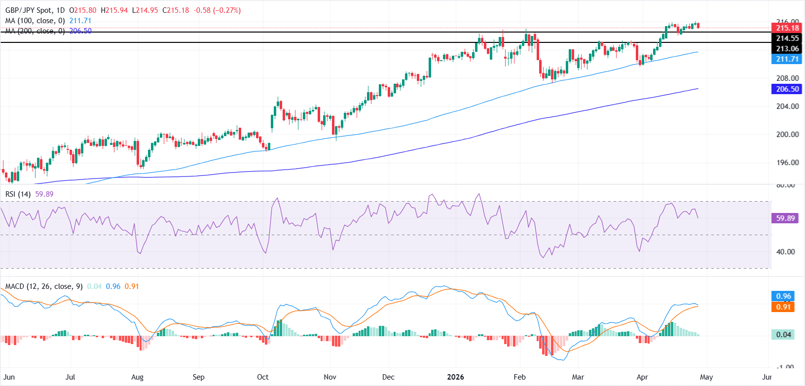 英镑(GBP)周二兑日元(JPY)走弱,因日本央行(BoJ)最新货币政策决定后,日元获得支撑。撰写本文时,英镑/日元交投于215.18附近,日内下跌近0.27%,但仍维持在两周区间内。