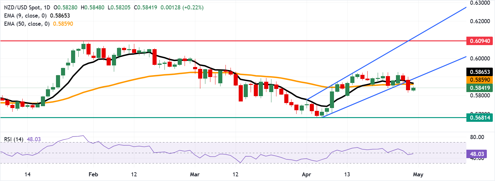 纽元/美元在连续两天下跌后回升,周四欧洲时段交易于0.5840附近。日线图的技术分析显示,随着该货币对仍位于上升通道下方,出现了看跌倾向。