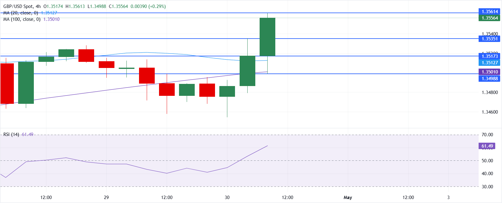 英镑/美元货币对周四上涨0.6%,交投于约1.3550水平,此前英国央行(BOE)以8比1的投票结果将利率维持在3.75%不变,同时美国GDP增长低于预期。